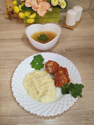 Суп гороховый - 250гр, фрикадельки мясные - 100гр, картофельное пюре - 200 гр